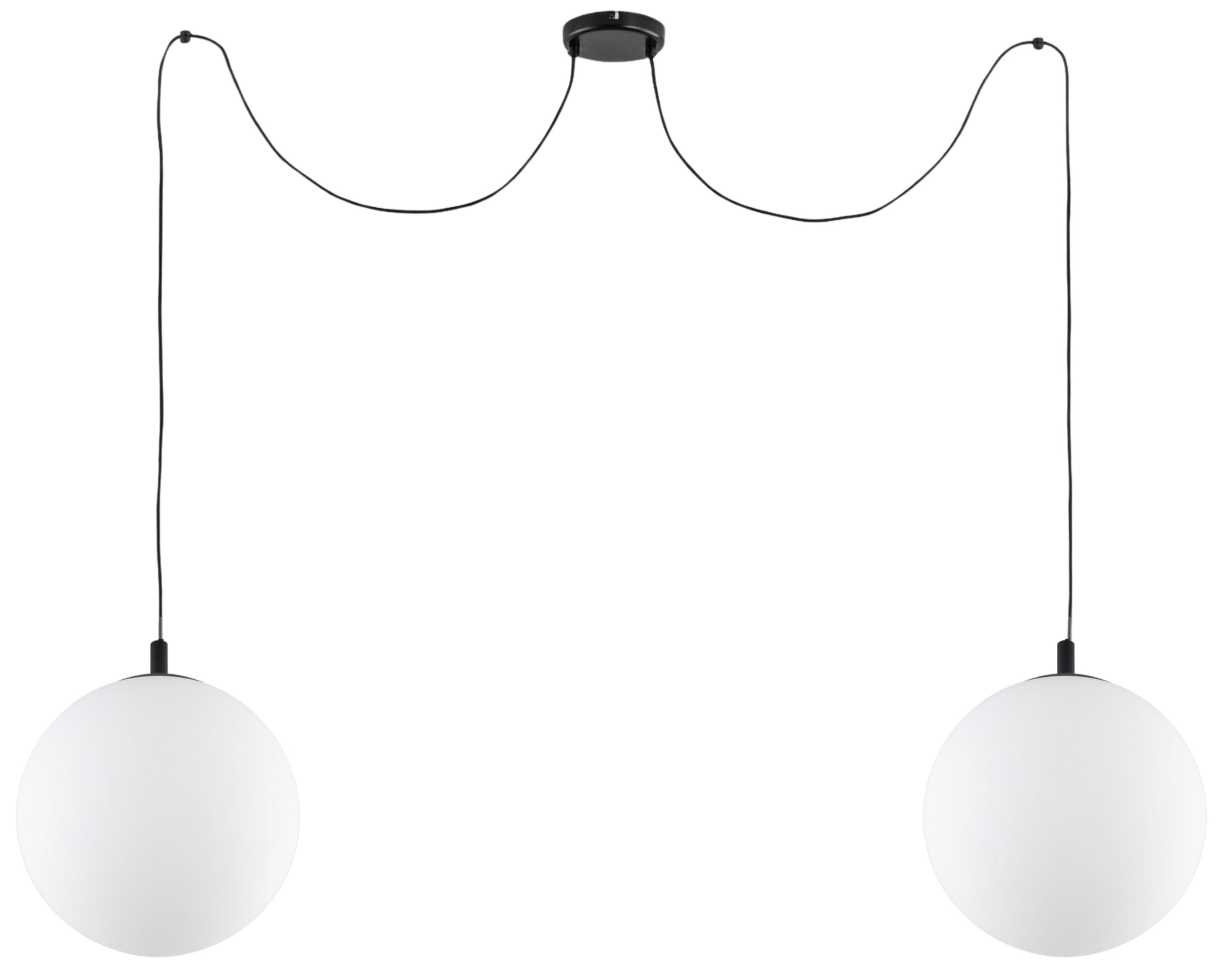Lampa pająk z dwoma dużymi szklanymi kloszami o średnicy 30 cm to proste i wyraziste oświetlenie do salonu, jadalni lub nad stół. Dwa zwisy pozwalają równomiernie rozłożyć światło, a mleczne szkło zapewnia spokojne, rozproszone oświetlenie bez ostrych cieni.