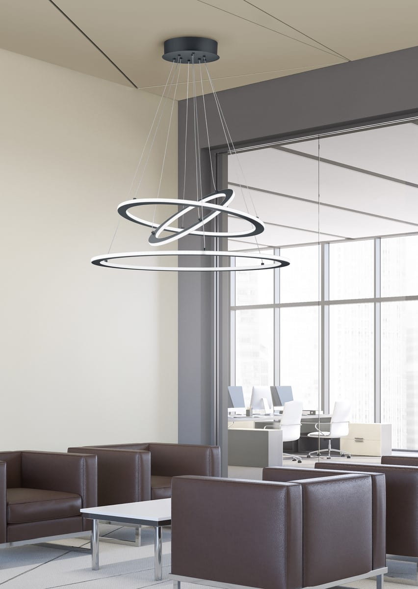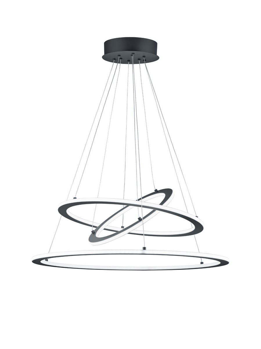 Lampa wisząca LED w kolorze czarnym, posiadajaca trzy okręgi o średnicy 40, 60 oraz 80cm. Można je regulować w dowolny sposób. Lampa świeci ciepłym światłem o temperaturze barwowej 3000K i posiada duży strumień świetlny 8000lm, co można w przybliżeniu porównać z tradycyjną żarówką o mocy 640W.