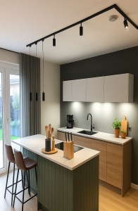 System szynowy 1-fazowy to połączenie estetyki i funkcjonalności. Czarna, matowa szyna doskonale wpisuje się w nowoczesne aranżacje wnętrz. Wiszące lampy nadają charakteru i świetnie sprawdzają się nad stołem lub blatem, natomiast reflektory można skierować na konkretne strefy – zlew, blat roboczy, dekorację ścienną czy regał. Wszystko to przy maksymalnej elastyczności i możliwości modyfikacji układu.