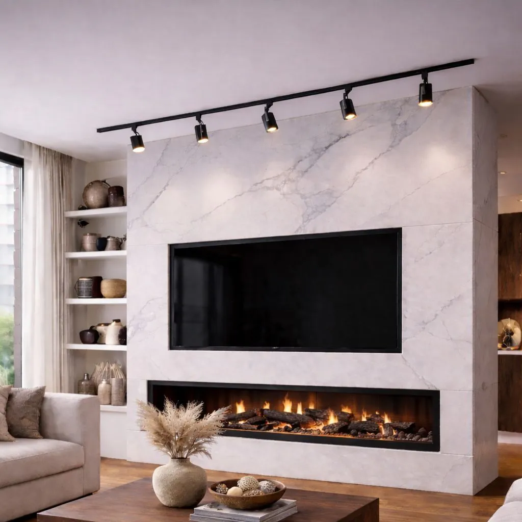 Taki układ pozwala równomiernie oświetlić większą powierzchnię lub skierować światło na konkretne miejsca, np. ścianę z telewizorem, kominek czy elementy dekoracyjne. Rozwiązanie sprawdza się w salonie, kuchni oraz przestrzeniach otwartych, gdzie liczy się możliwość regulacji kierunku światła.