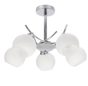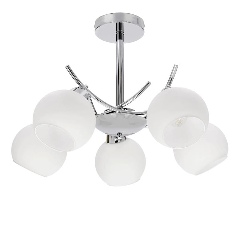 Pięć kloszy w kształcie idealnych kul, wykonanych z mlecznobiałego szkła, subtelnie rozprasza światło, tworząc przytulną atmosferę w każdym pomieszczeniu. Chromowana konstrukcja, z precyzyjnie wygiętymi ramionami, nadaje lampie dynamiczny, ale harmonijny wygląd. Dzięki błyszczącemu, srebrnemu wykończeniu żyrandol doskonale odbija światło, wprowadzając do wnętrza nutę luksusu.