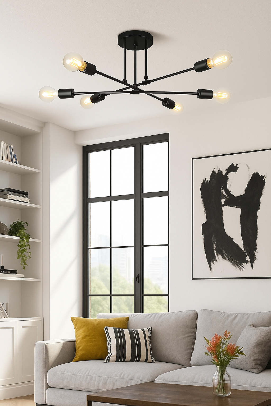 Lampa Norah 6 doskonale wpisuje się w aranżacje w stylu nowoczesnym, minimalistycznym i modern mid-century. Jej czarna, matowa struktura dobrze kontrastuje z jasnymi ścianami, naturalnym drewnem i neutralnymi tkaninami. Stanowi efektowny akcent w przestrzeniach stonowanych, gdzie liczy się forma, a nie ozdobność.