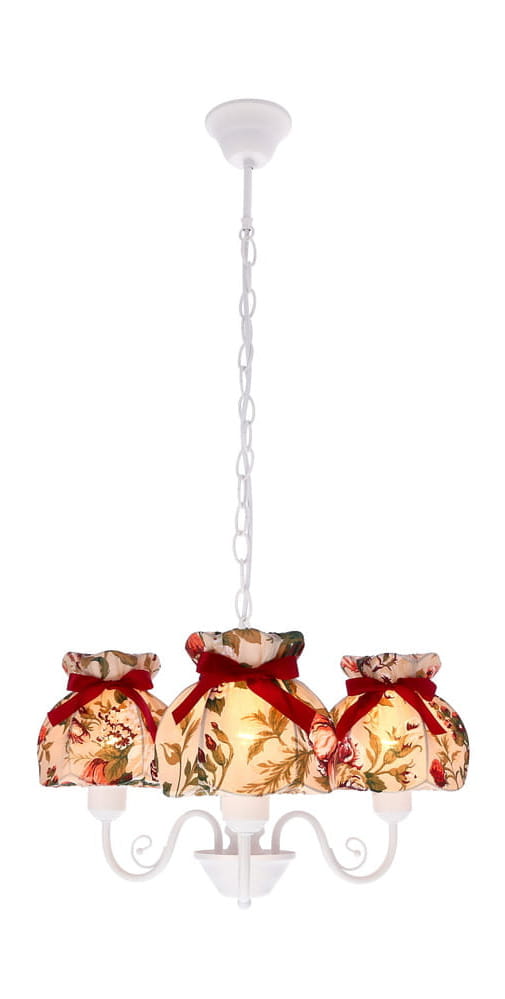 Abażury wykonane zostały z miękkiej tkaniny w kwiatowy wzór – całość uzupełniona została czerwoną kokardą, która nadaje lampie niepowtarzalnego wdzięku. Białe, metalowe ramiona zwieńczone zostały trzema punktami świetlnymi, co zapewnia odpowiedni poziom jasności nawet w większych pomieszczeniach.