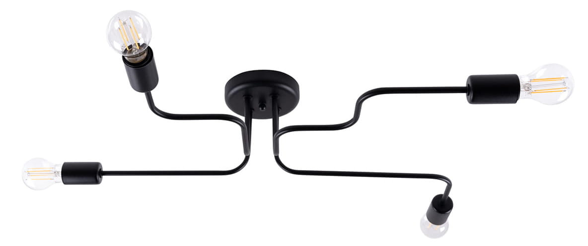 Nowoczesna forma tego żyrandola opiera się na czterech smukłych, metalowych ramionach, które tworzą symetryczny i spójny układ. Dzięki temu oświetlenie jest równomiernie rozprowadzone, a jednocześnie podkreśla surowy loftowy styl.